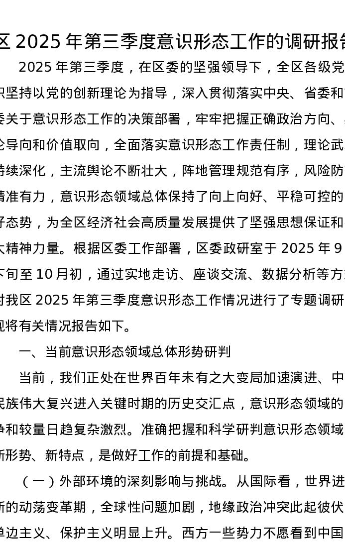 区2025年第三季度意识形态工作的调研报告