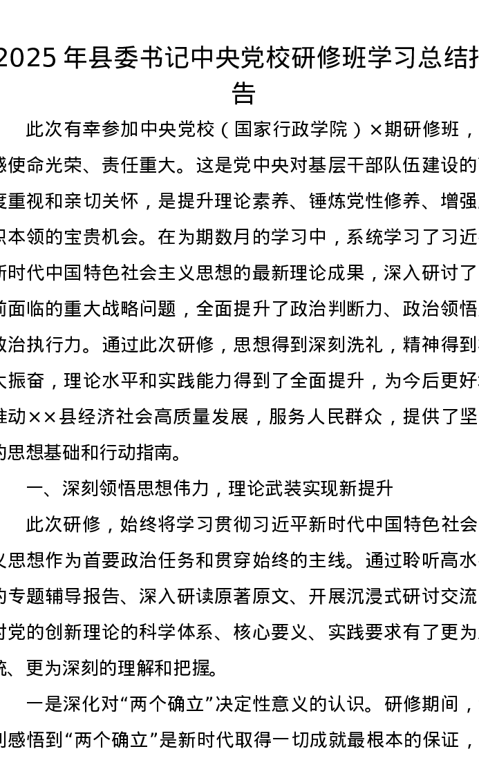 2025年县委书记中央党校研修班学习总结报告