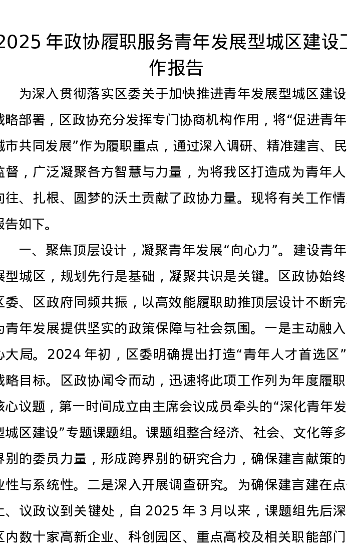2025年政协履职服务青年发展型城区建设工作报告