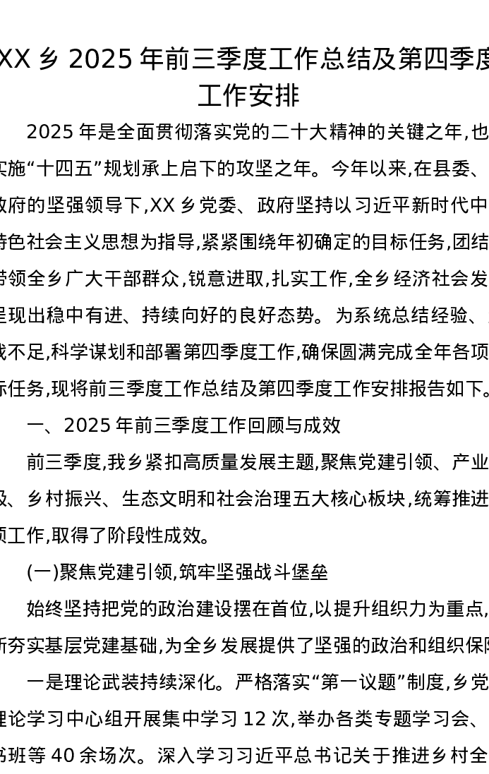 XX乡2025年前三季度工作总结及第四季度工作安排