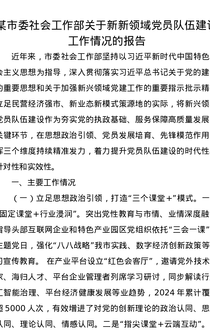 某市委社会工作部关于新新领域党员队伍建设工作情况的报告