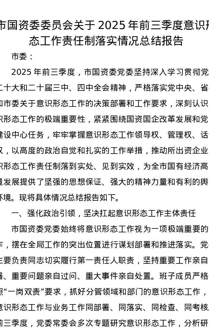 市国资委委员会关于2025年前三季度意识形态工作责任制落实情况总结报告