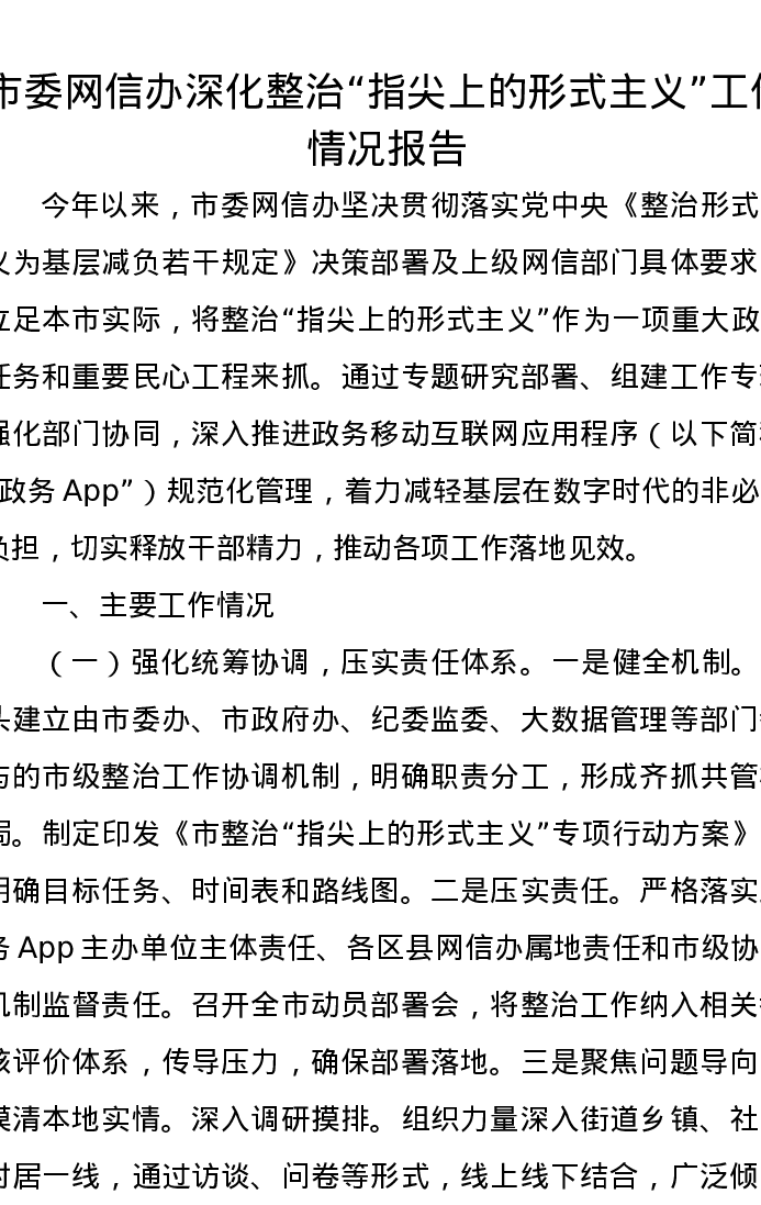 市委网信办深化整治“指尖上的形式主义”工作情况报告