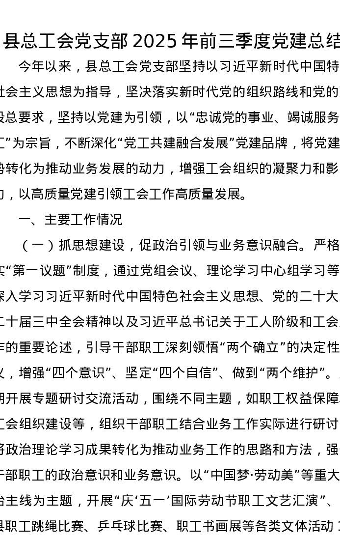 县总工会党支部2025年前三季度党建总结