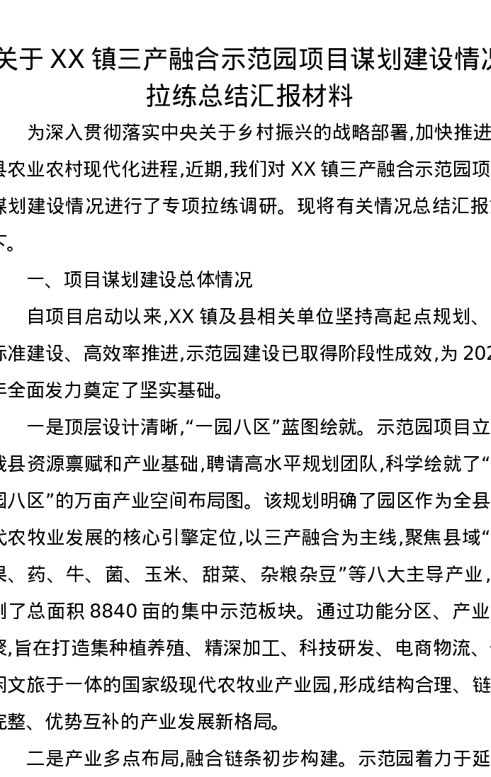 关于XX镇三产融合示范园项目谋划建设情况拉练总结汇报材料