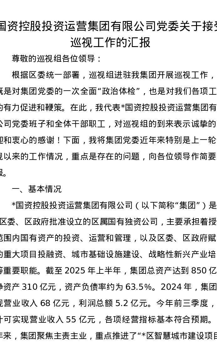 国资控股投资运营集团有限公司党委关于接受巡视工作的汇报