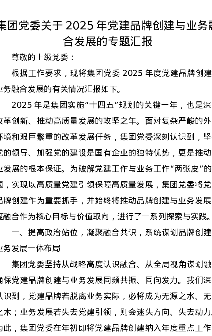 集团党委关于2025年党建品牌创建与业务融合发展的专题汇报