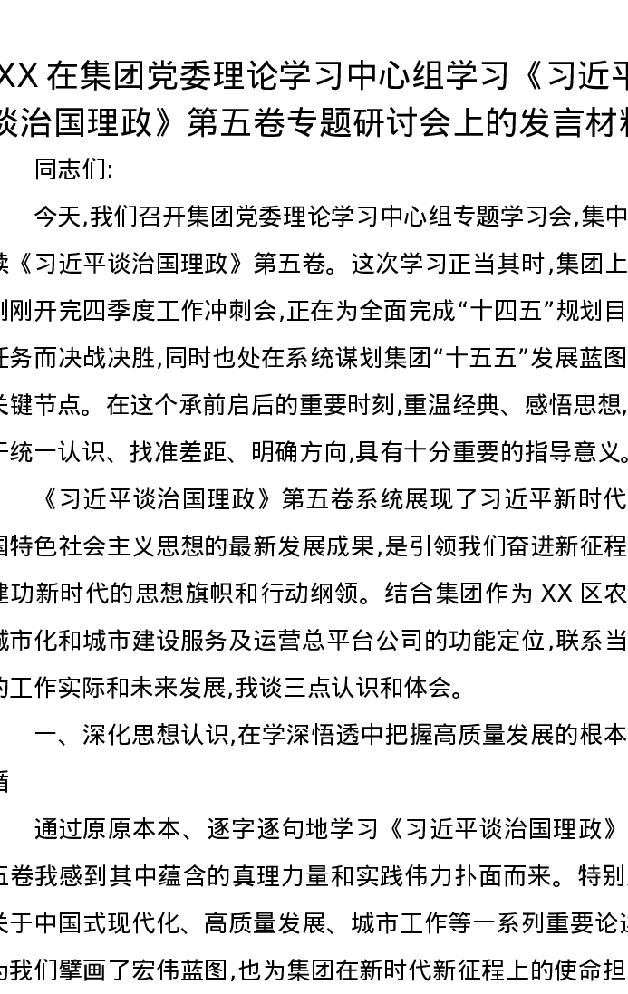 XX在集团党委理论学习中心组学习《习近平谈治国理政》第五卷专题研讨会上的发言材料