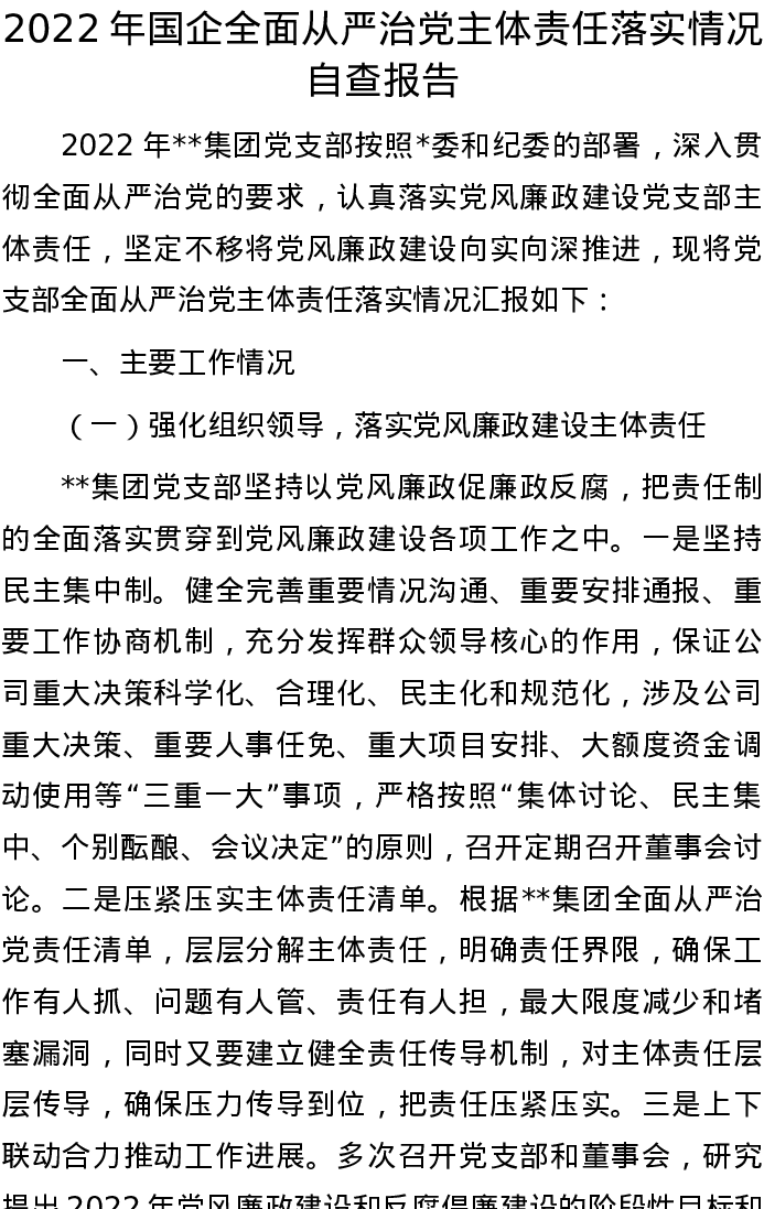 202208202022年国企全面从严治党主体责任落实情况自查报告