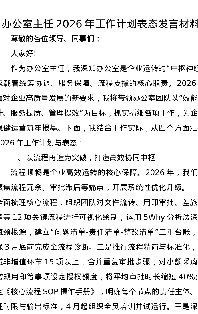 办公室主任2026年工作计划表态发言材料
