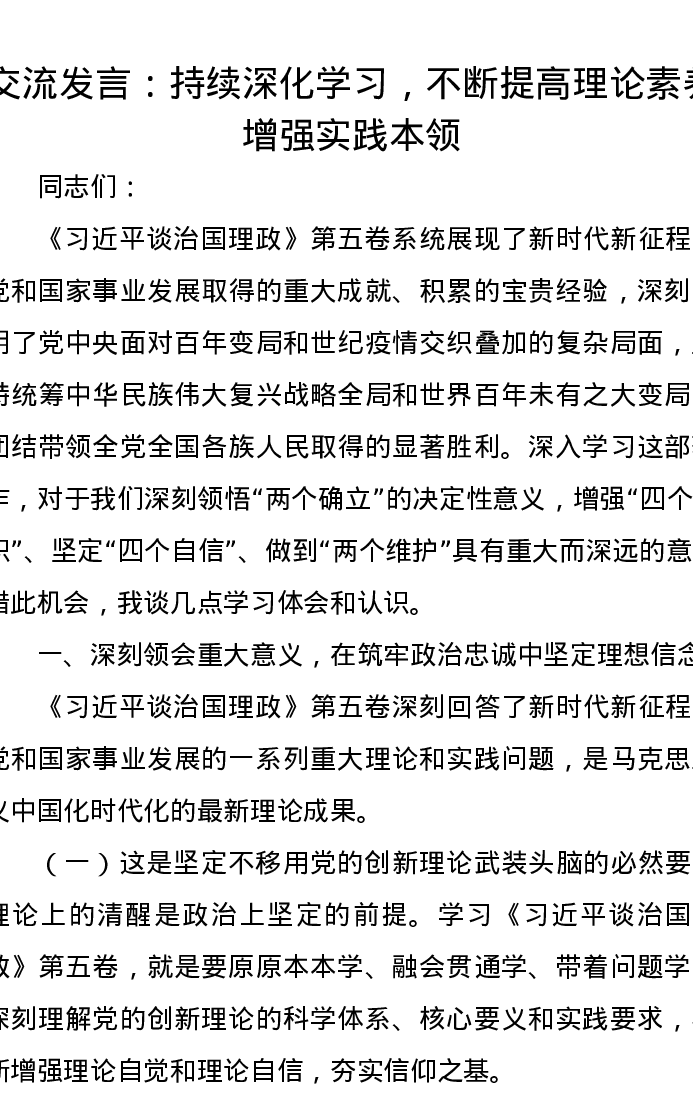 交流发言:持续深化学习,不断提高理论素养,增强实践本领