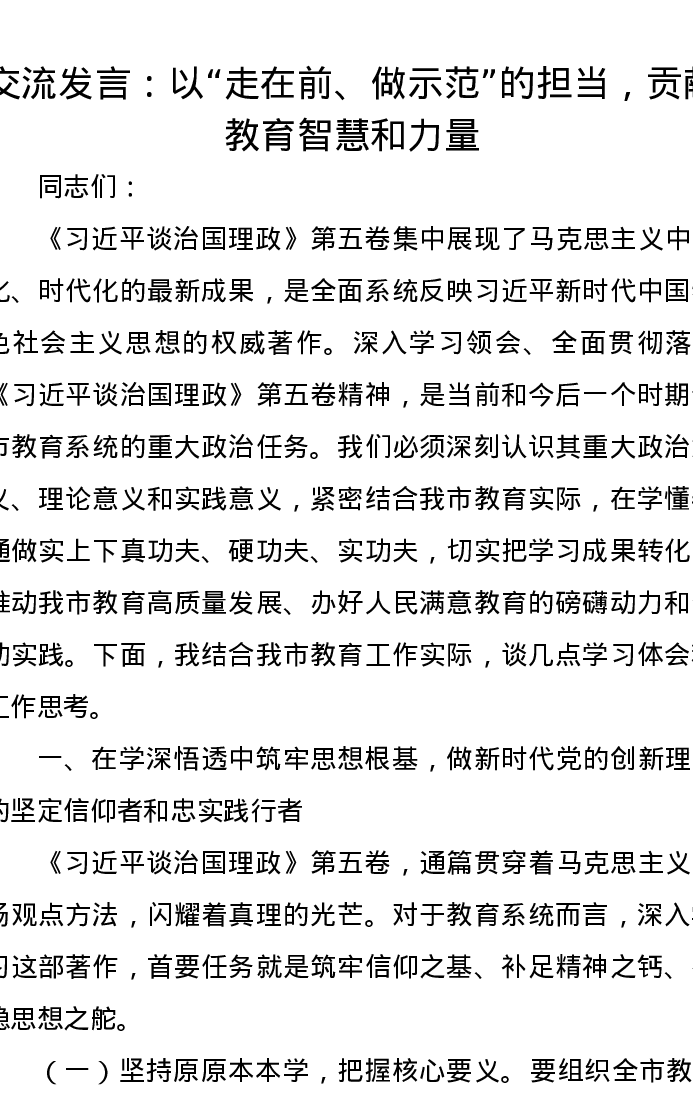交流发言:以“走在前、做示范”的担当,贡献教育智慧和力量