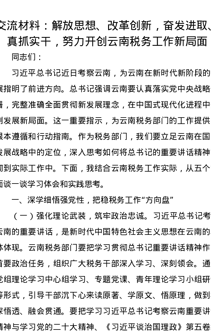 交流发言材料:解放思想、改革创新,奋发进取、真抓实干,努力开创云南税务工作新局面