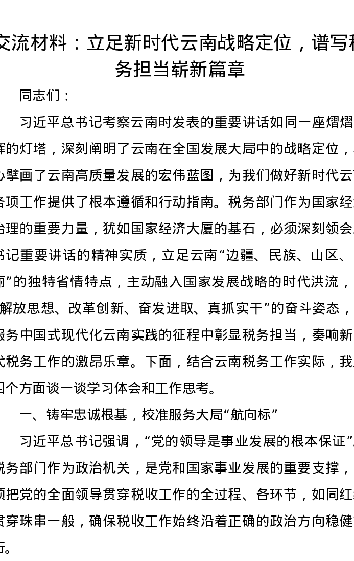 交流发言材料:立足新时代云南战略定位,谱写税务担当崭新篇章