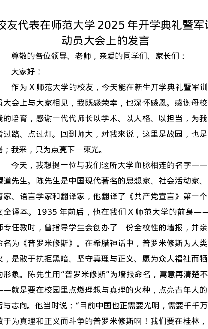 校友代表在师范大学2025年开学典礼暨军训动员大会上的发言