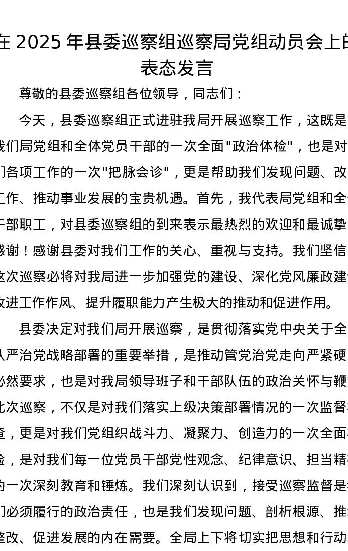 在2025年县委巡察组巡察局党组动员会上的表态发言