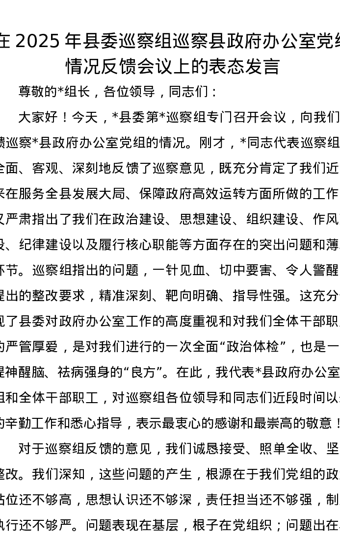 在2025年县委巡察组巡察县政府办公室党组情况反馈会议上的表态发言