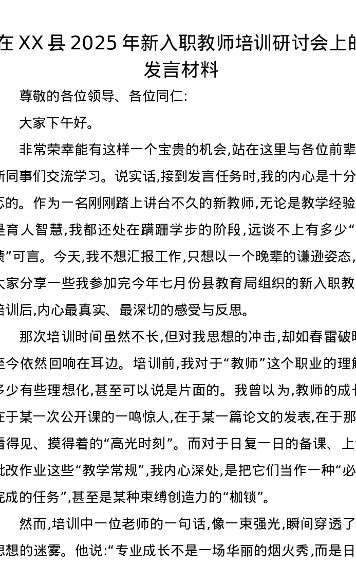 在XX县2025年新入职教师培训研讨会上的发言材料