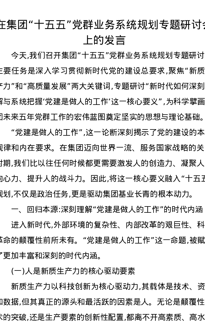 在集团“十五五”党群业务系统规划专题研讨会上的发言