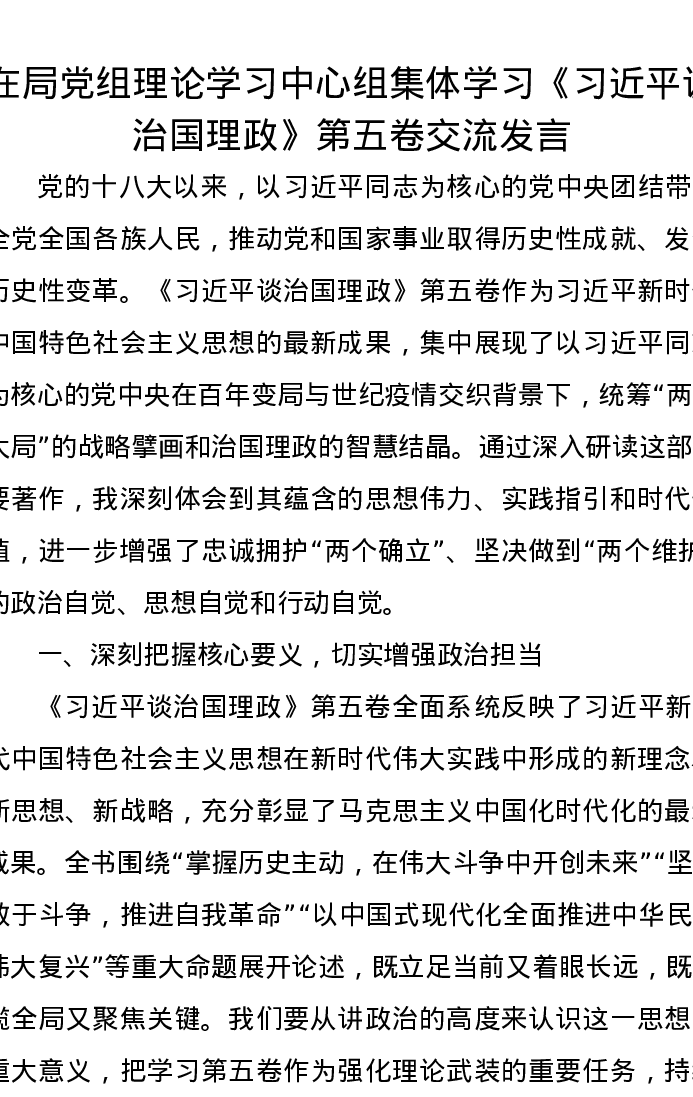 在局党组理论学习中心组集体学习《习近平谈治国理政》第五卷交流发言