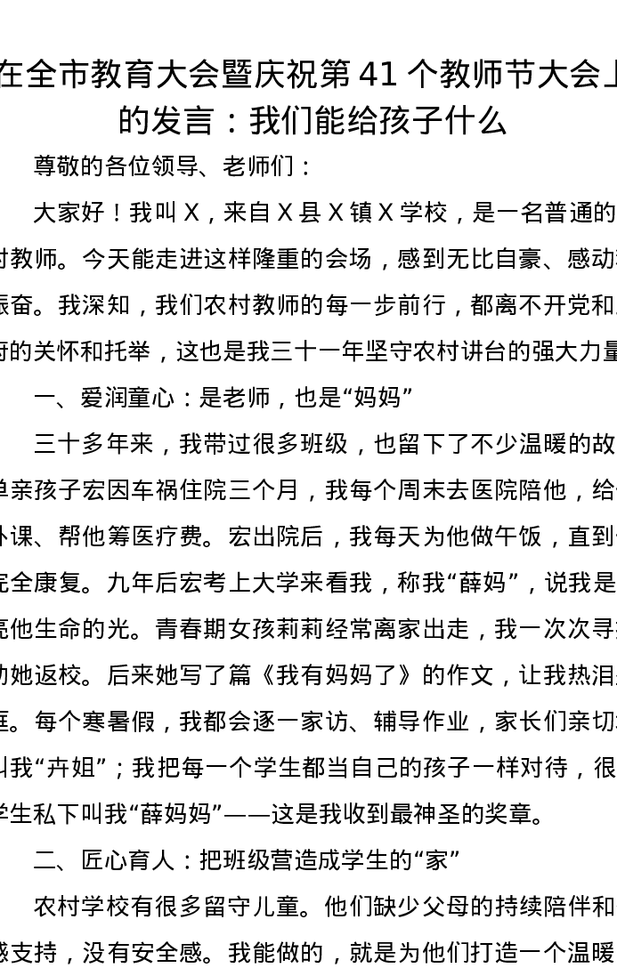 在全市教育大会暨庆祝第41个教师节大会上的发言:我们能给孩子什么