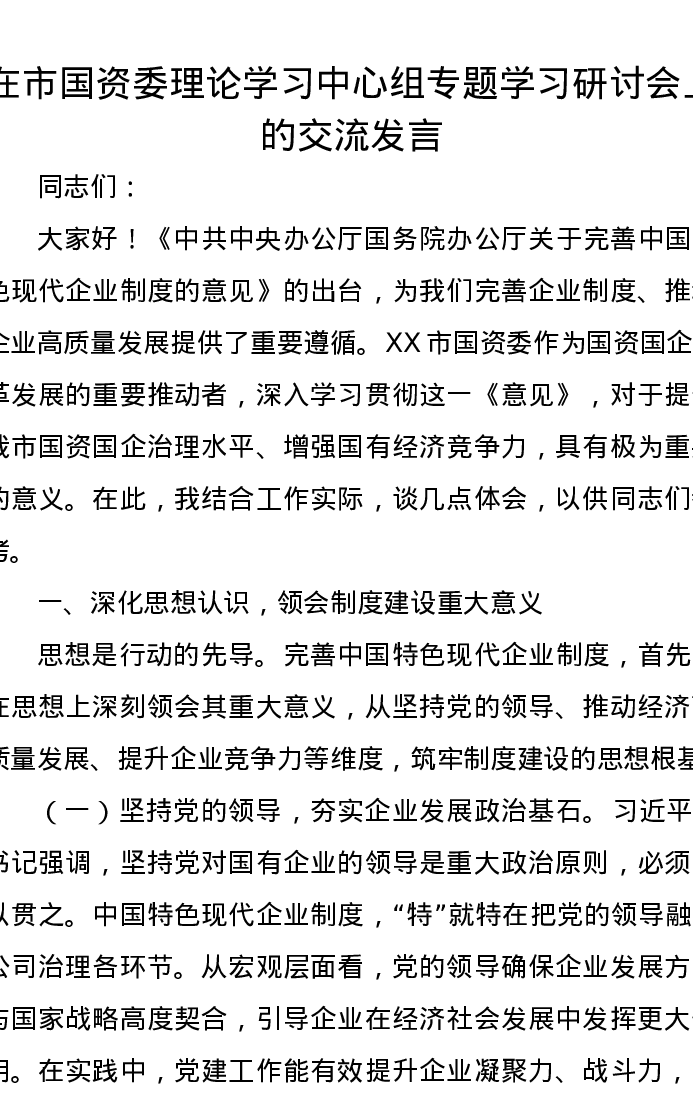在市国资委理论学习中心组专题学习研讨会上的交流发言