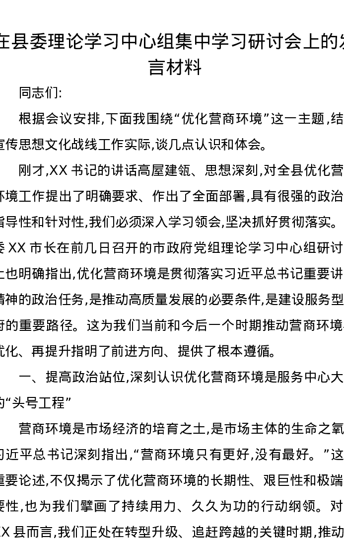 在县委理论学习中心组集中学习研讨会上的发言材料(优化营商环境)