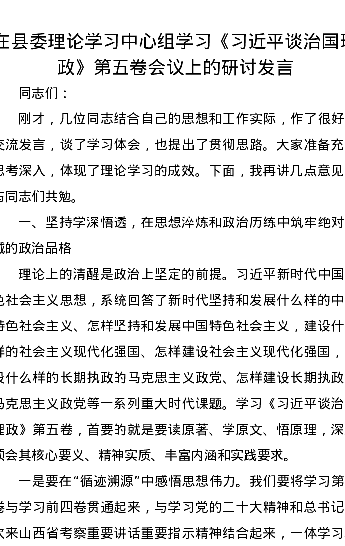 在县委理论学习中心组学习《习近平谈治国理政》第五卷会议上的研讨发言