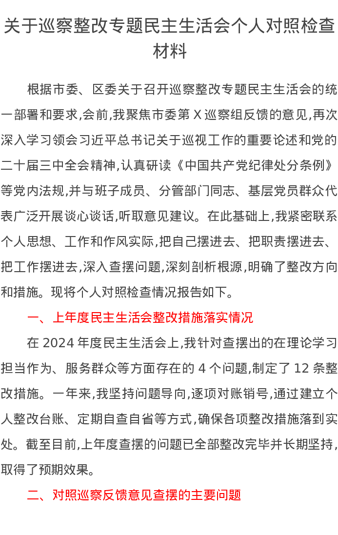 关于巡察整改专题民主生活会个人对照检查材料