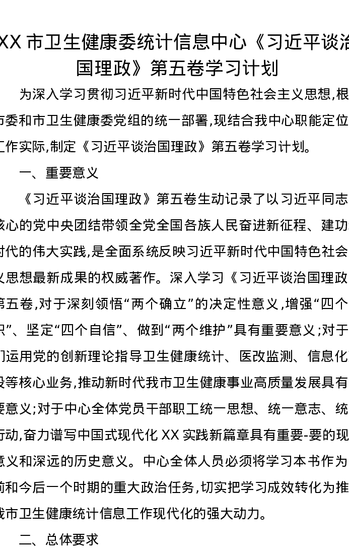 XX市卫生健康委统计信息中心《习近平谈治国理政》第五卷学习计划