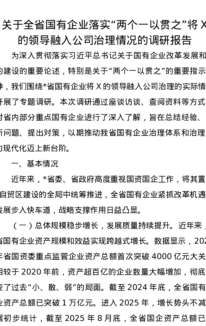 关于XX省国有企业落实“两个一以贯之”将党的领导融入公司治理情况的调研报告