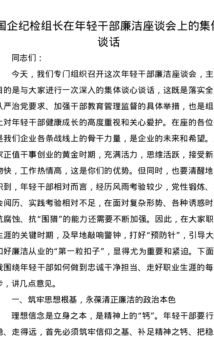国企纪检组长在年轻干部廉洁座谈会上的集体谈话