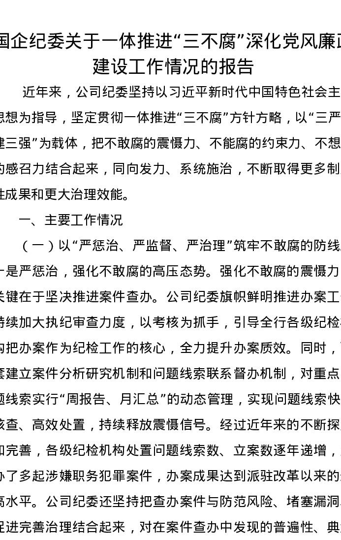 国企纪委关于一体推进“三不腐”深化党风廉政建设工作情况的报告