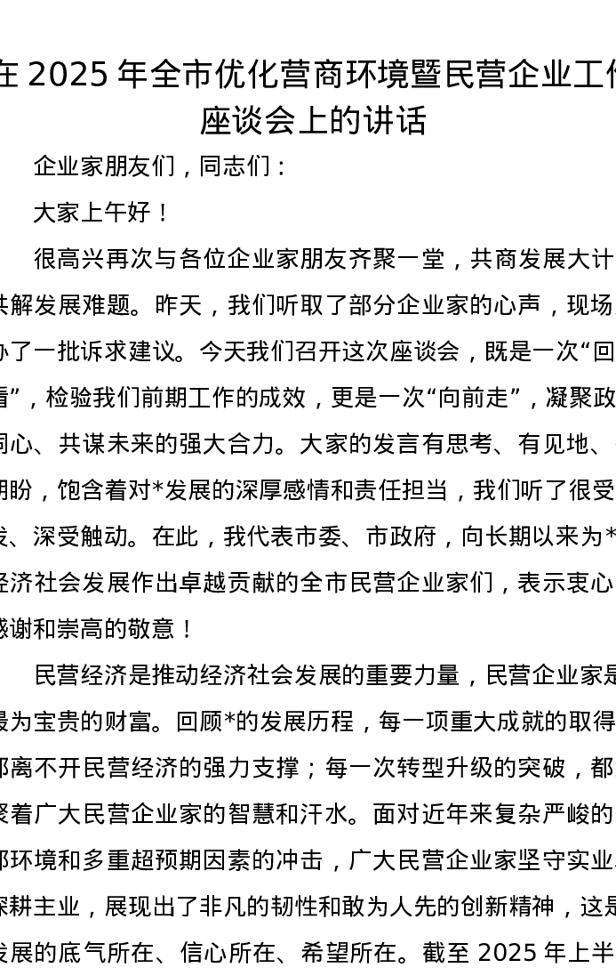 在2025年全市优化营商环境暨民营企业工作座谈会上的讲话