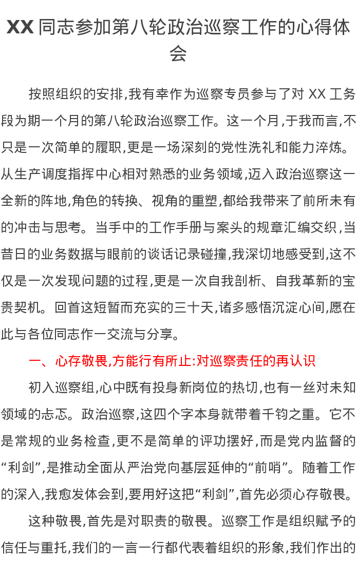 XX同志参加第八轮政治巡察工作的心得体会