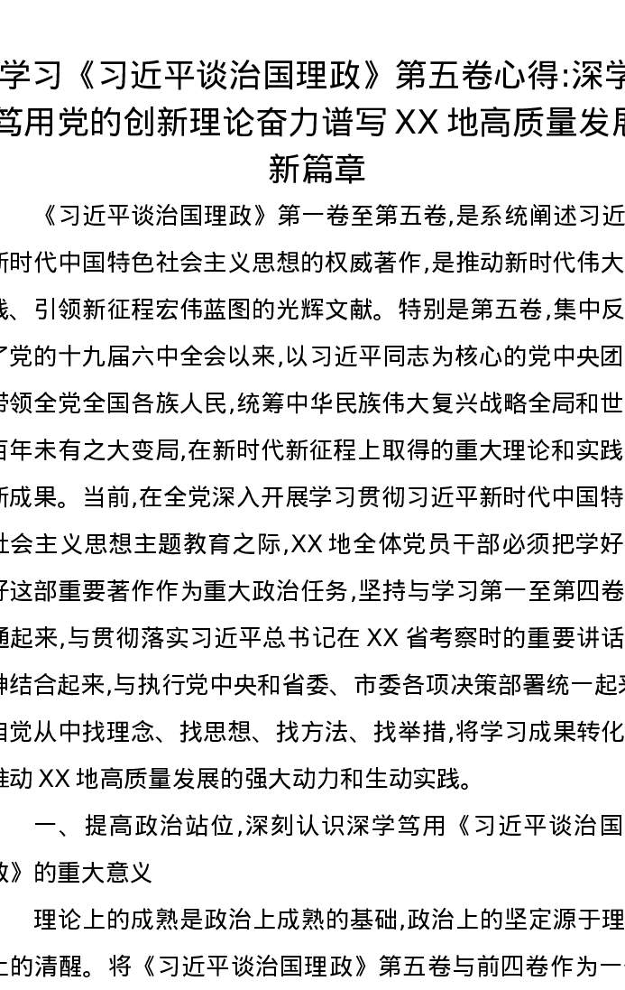 学习《习近平谈治国理政》第五卷心得:深学笃用党的创新理论奋力谱写XX地高质量发展新篇章