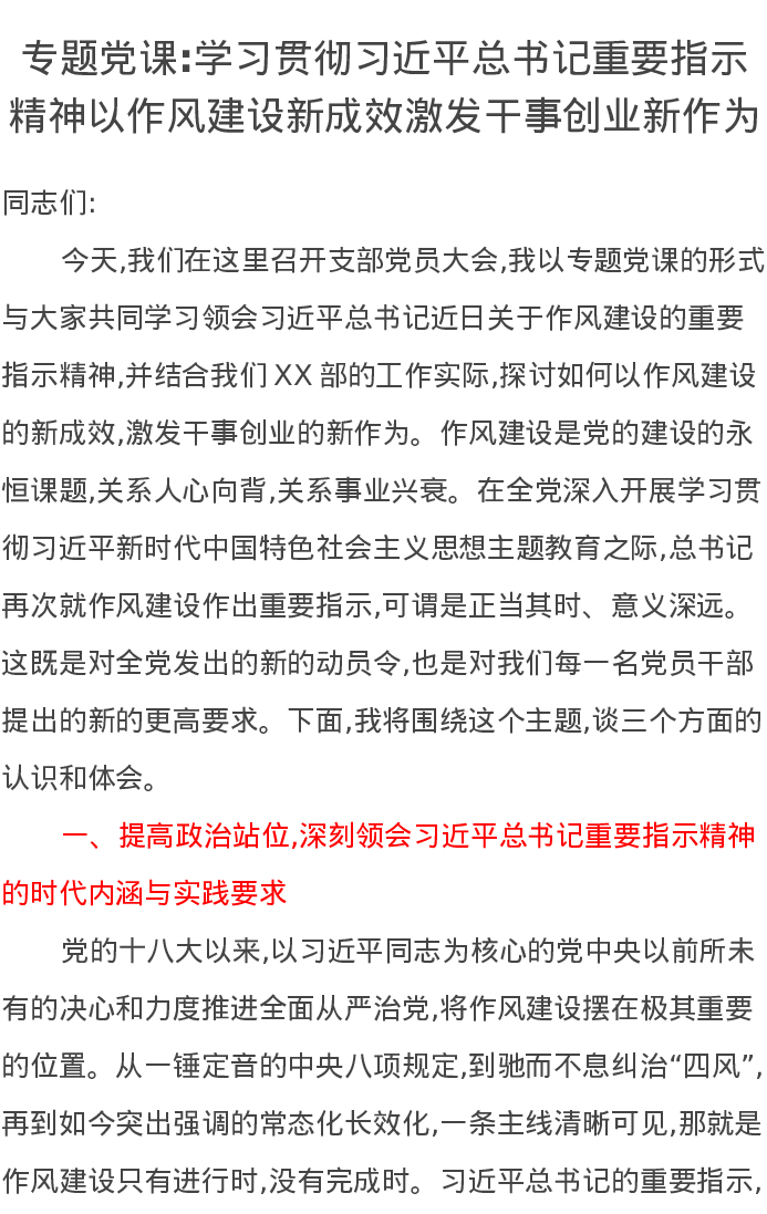 党课讲稿:学习贯彻习近平总书记重要指示精神以作风建设新成效激发干事创业新作为