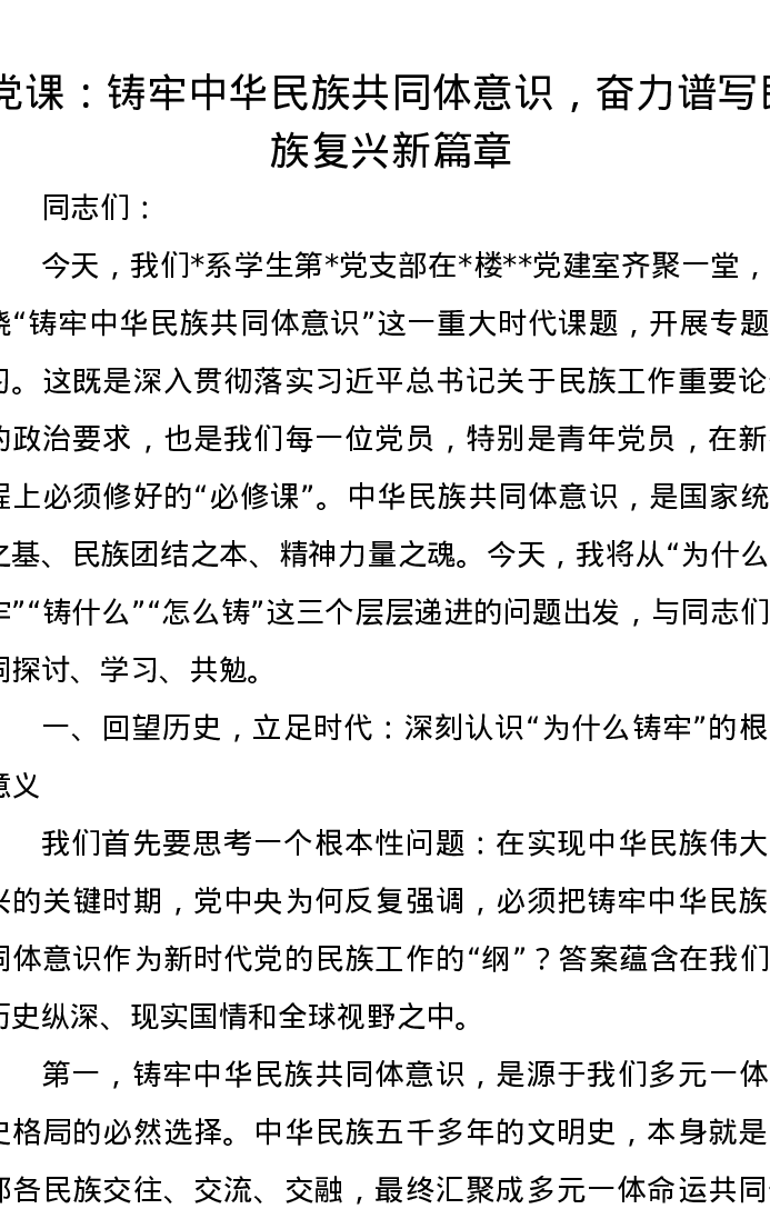 党课讲稿:铸牢中华民族共同体意识,奋力谱写民族复兴新篇章