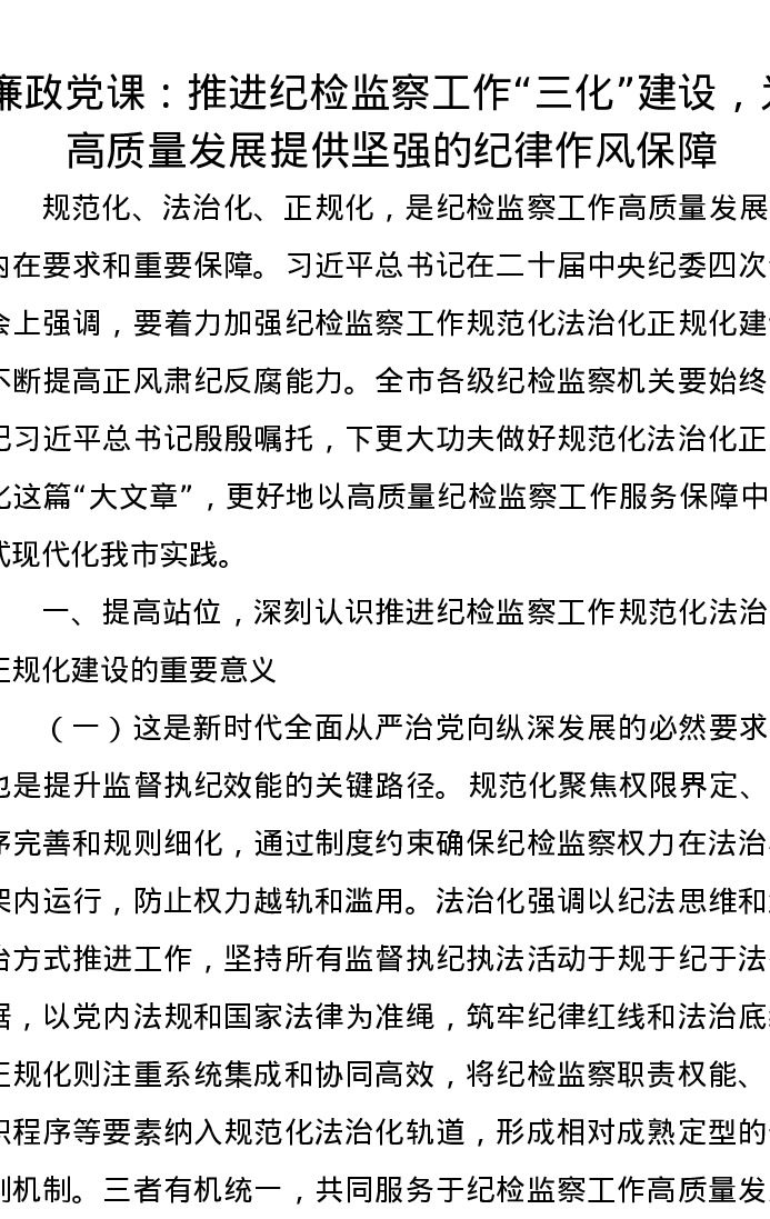廉政党课:推进纪检监察工作“三化”建设,为高质量发展提供坚强的纪律作风保障