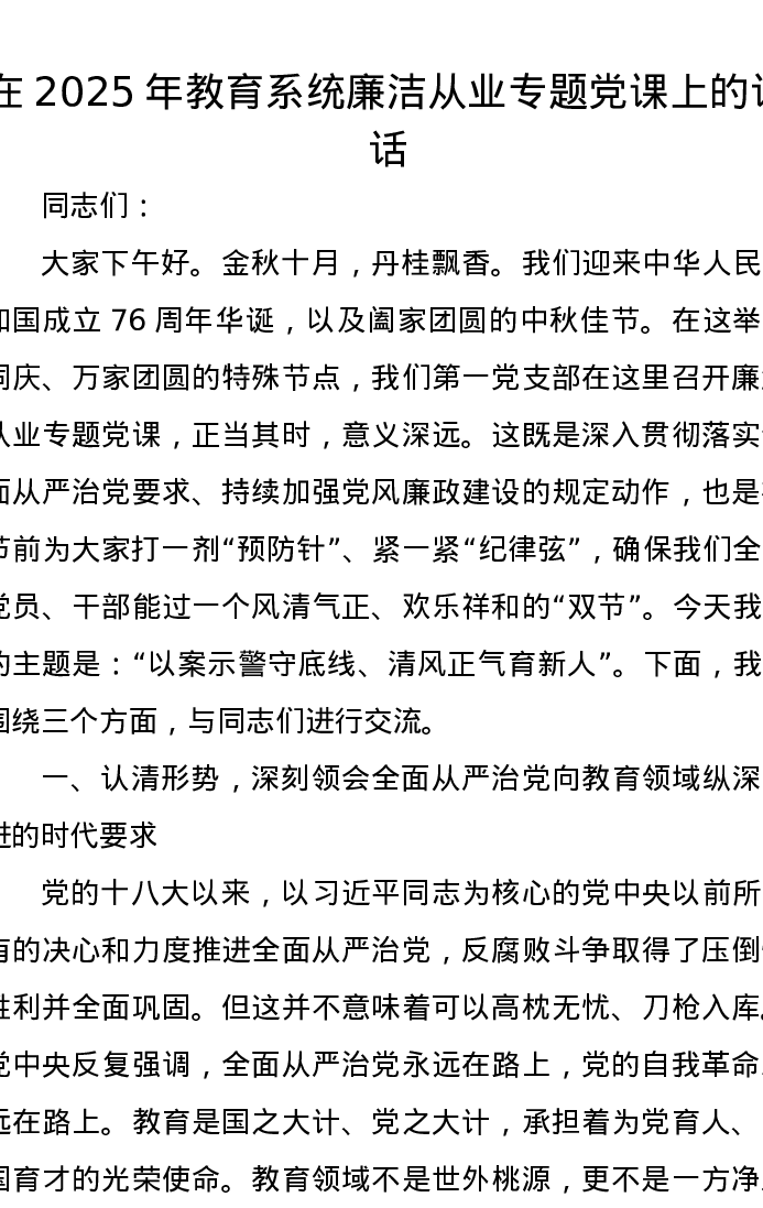 在2025年教育系统廉洁从业专题党课上的讲话