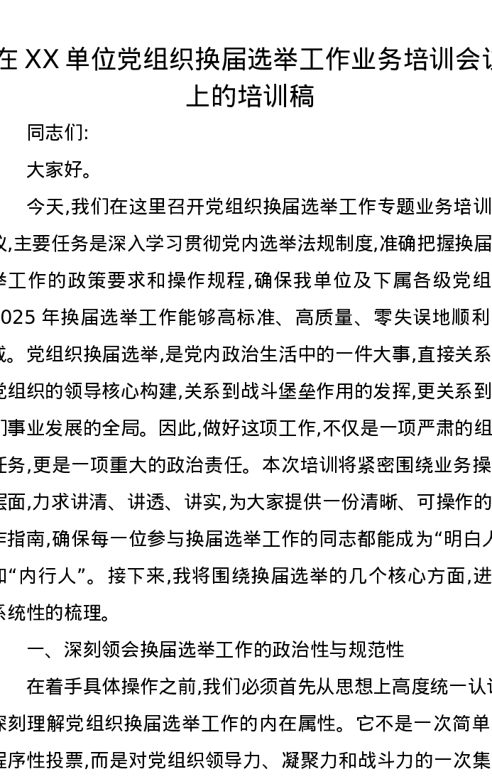 在XX单位党组织换届选举工作业务培训会议上的培训稿