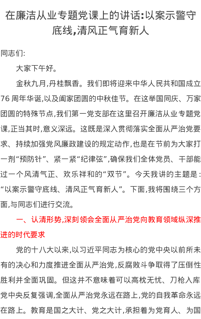 在廉洁从业专题党课上的讲话:以案示警守底线,清风正气育新人