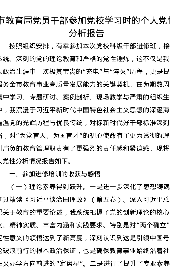 市教育局党员干部参加党校学习时的个人党性分析报告