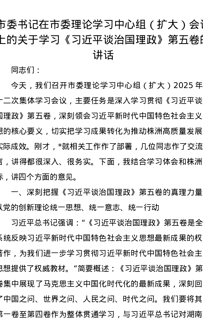 市委书记在市委理论学习中心组(扩大)会议上的关于学习《习近平谈治国理政》第五卷的讲话