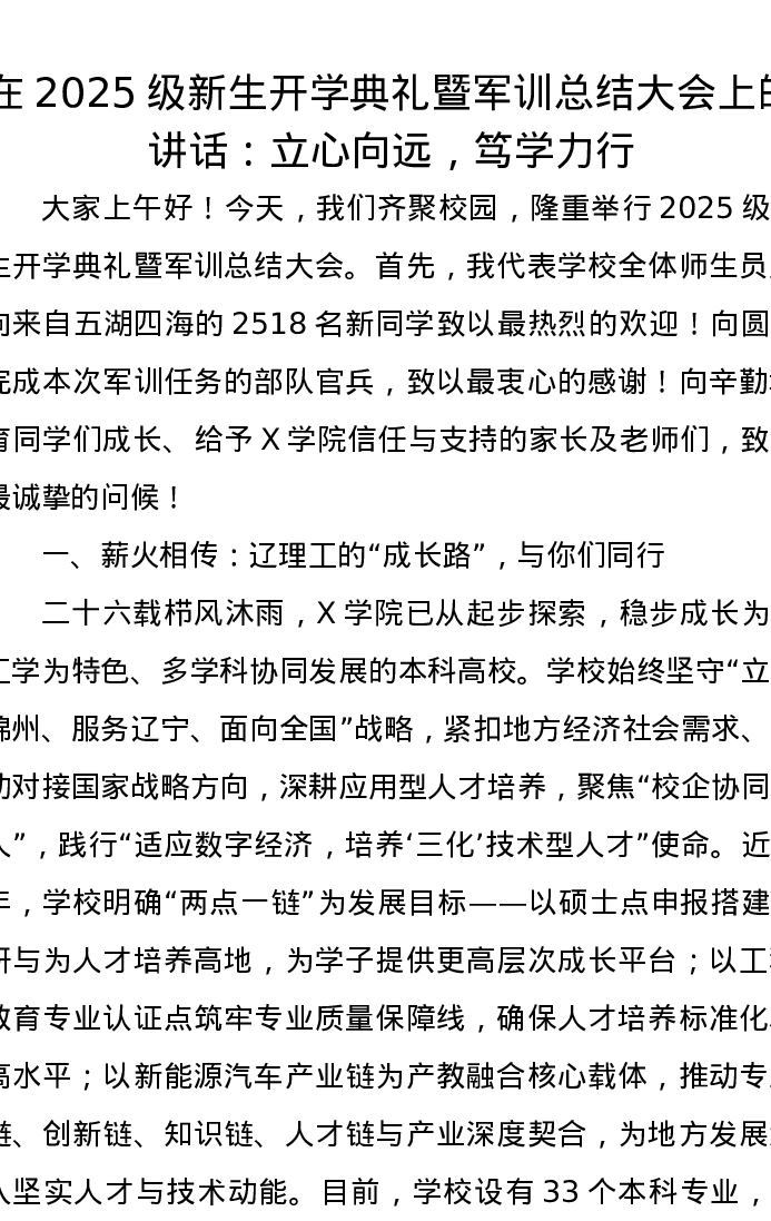 在2025级新生开学典礼暨军训总结大会上的讲话:立心向远,笃学力行