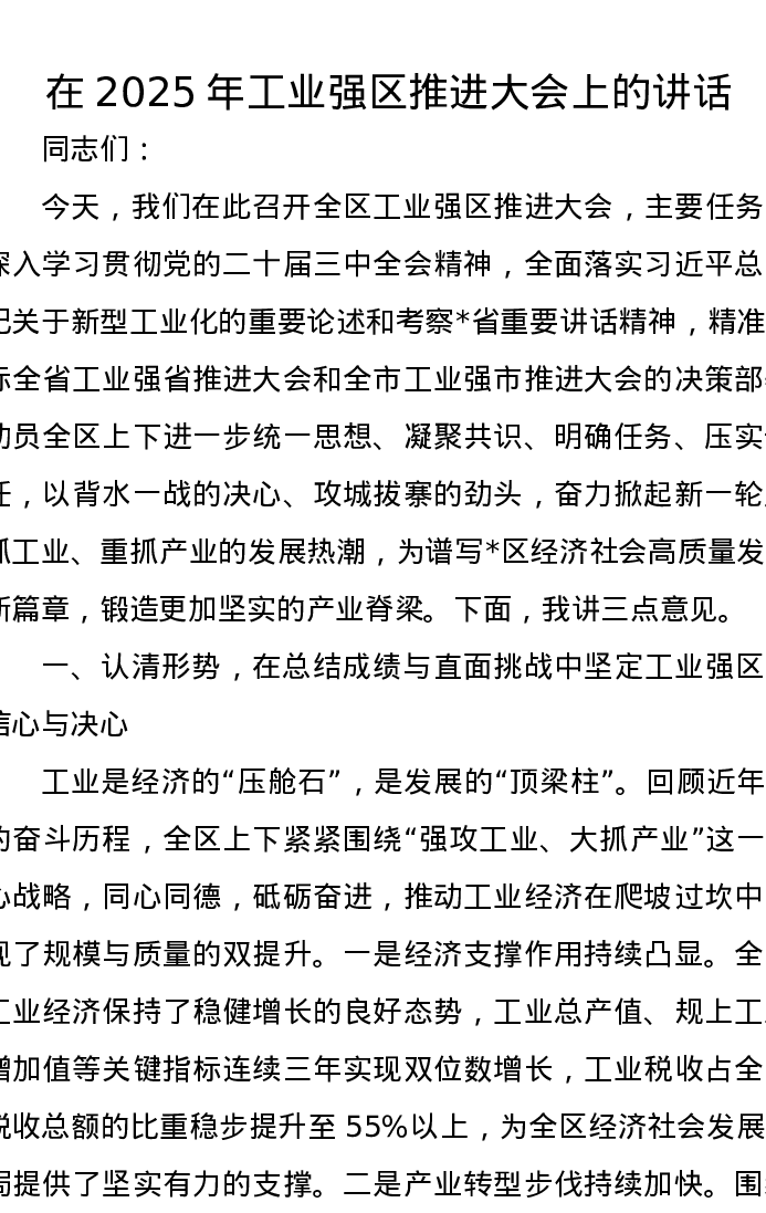 在2025年工业强区推进大会上的讲话