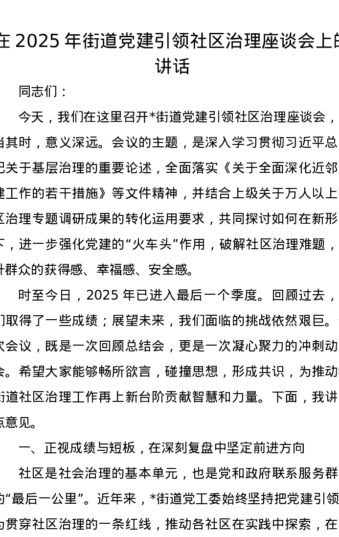 在2025年街道党建引领社区治理座谈会上的讲话