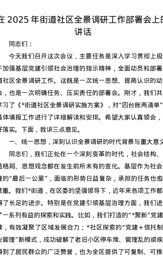 在2025年街道社区全景调研工作部署会上的讲话