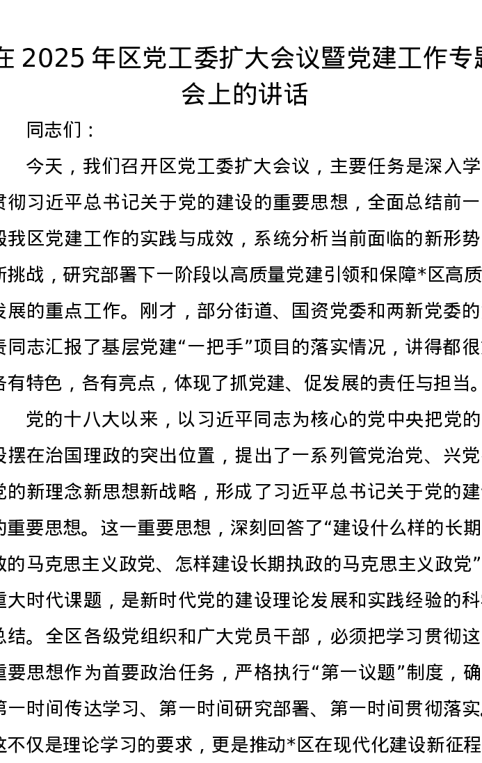 在2025年区党工委扩大会议暨党建工作专题会上的讲话