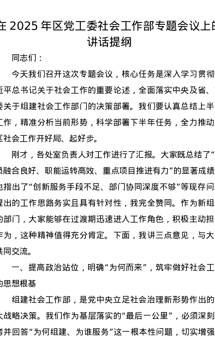 在2025年区党工委社会工作部专题会议上的讲话提纲